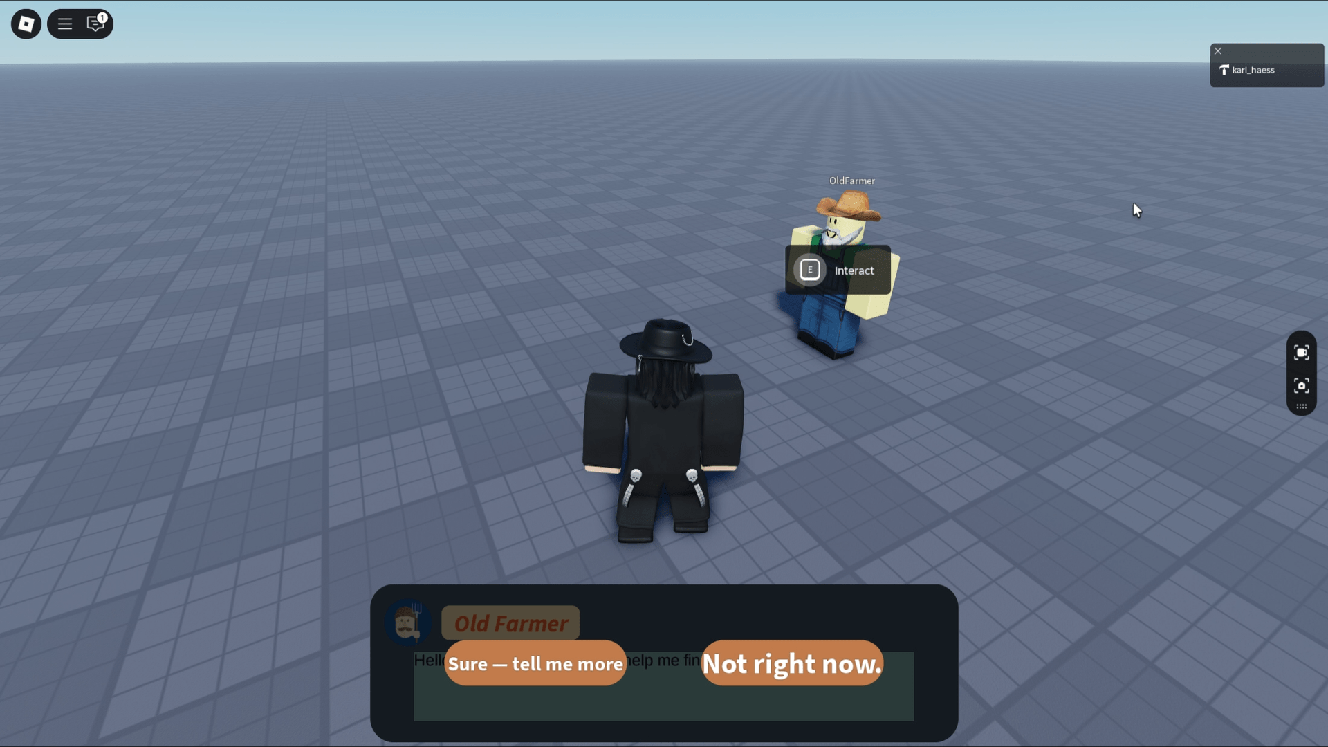 Click-to-talk NPCs with multi-page text, branching choices, and quest-trigger hooks.